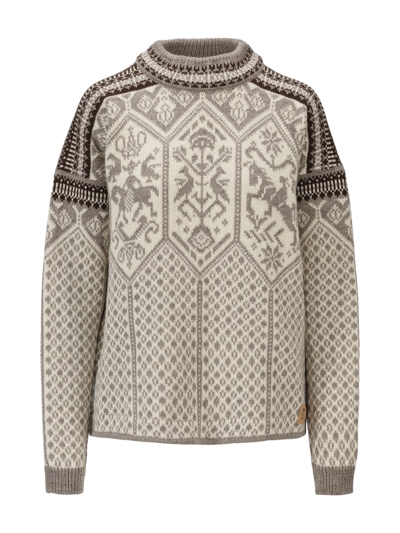 De vernieuwde trui uit 1994 behoudt de kenmerkende symbolen geïnspireerd op de Noorse mythologie, maar is gemaakt van een dunner, zachter garen, met een verbeterde pasvorm en een vernieuwd kleurenpalet. Hij is gebreid in onze fabriek in Dale, Noorwegen, en is gemaakt van 100% wol – net als het origineel.